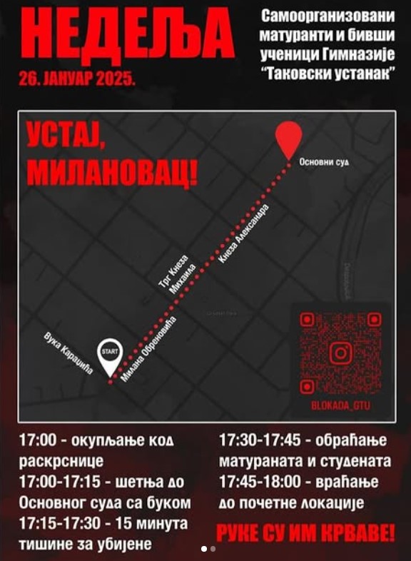 Učenici maturantske generacije milanovačke Gimnazije „Takovski ustanak“, pored svakodnevnog odavanja pošte žrtvama ćutanjem na Trgu od 11.52 do 12.07, najavili su i program skupa za nedelju uveče.
