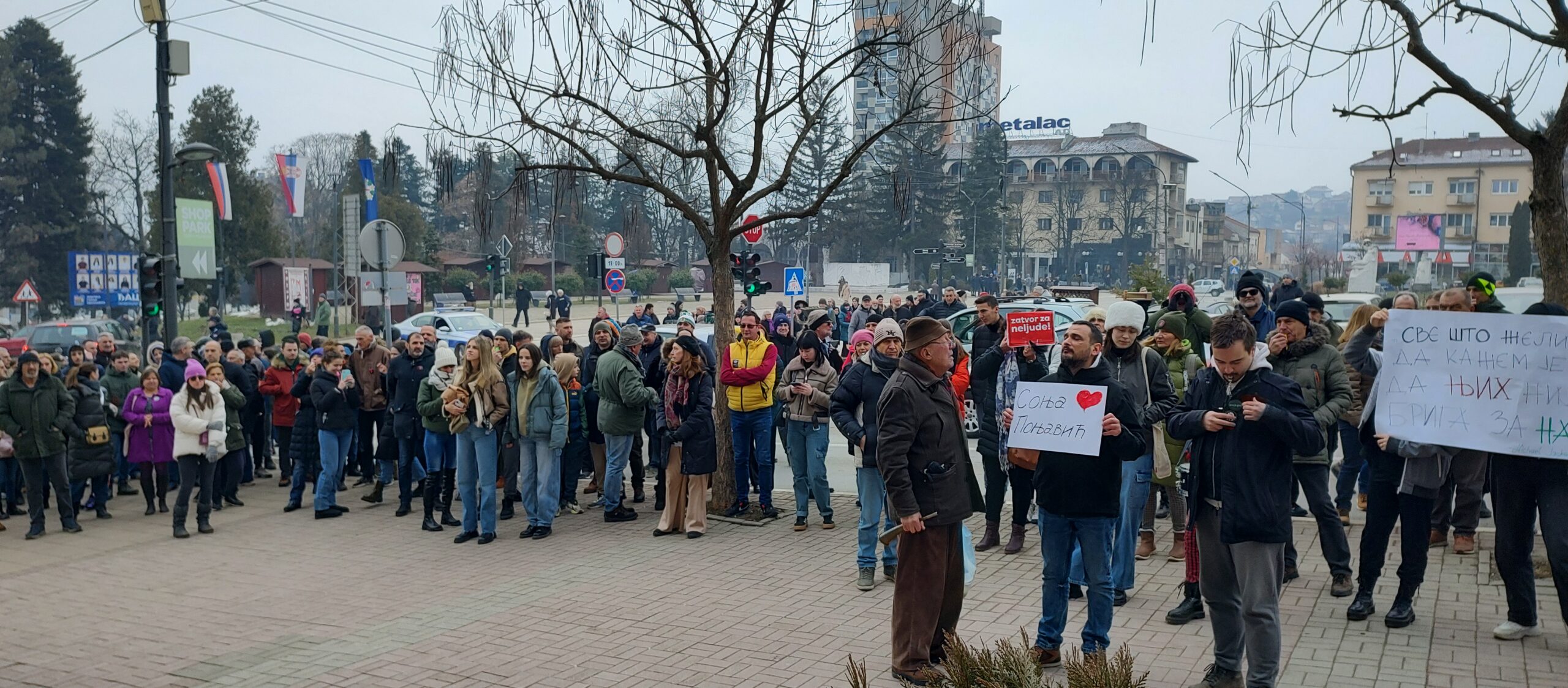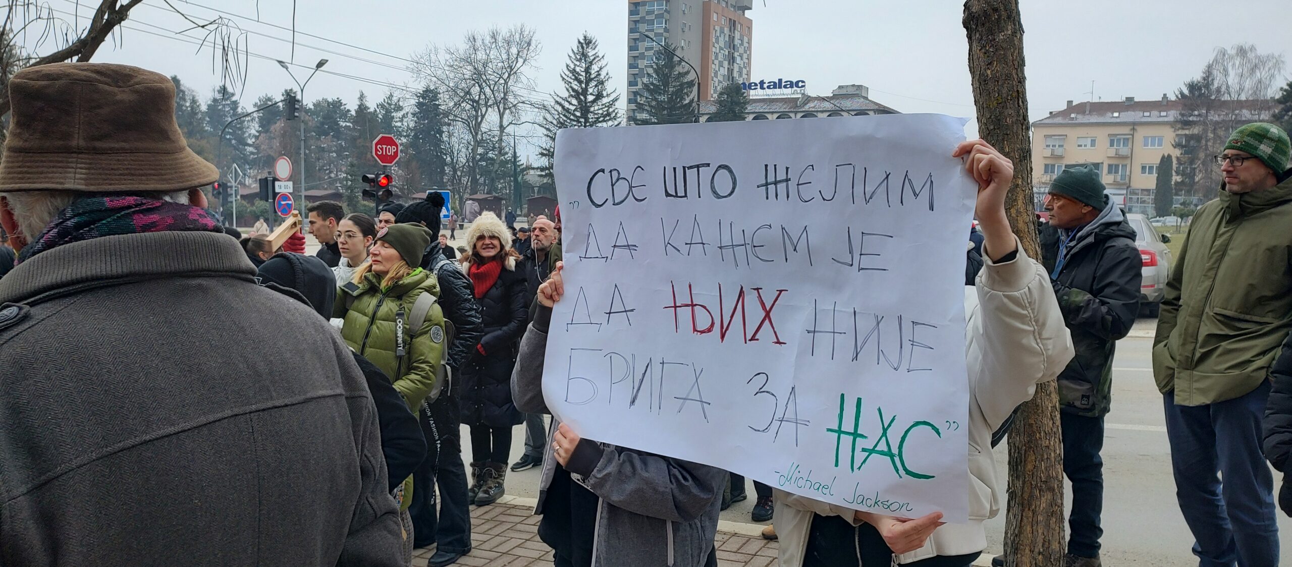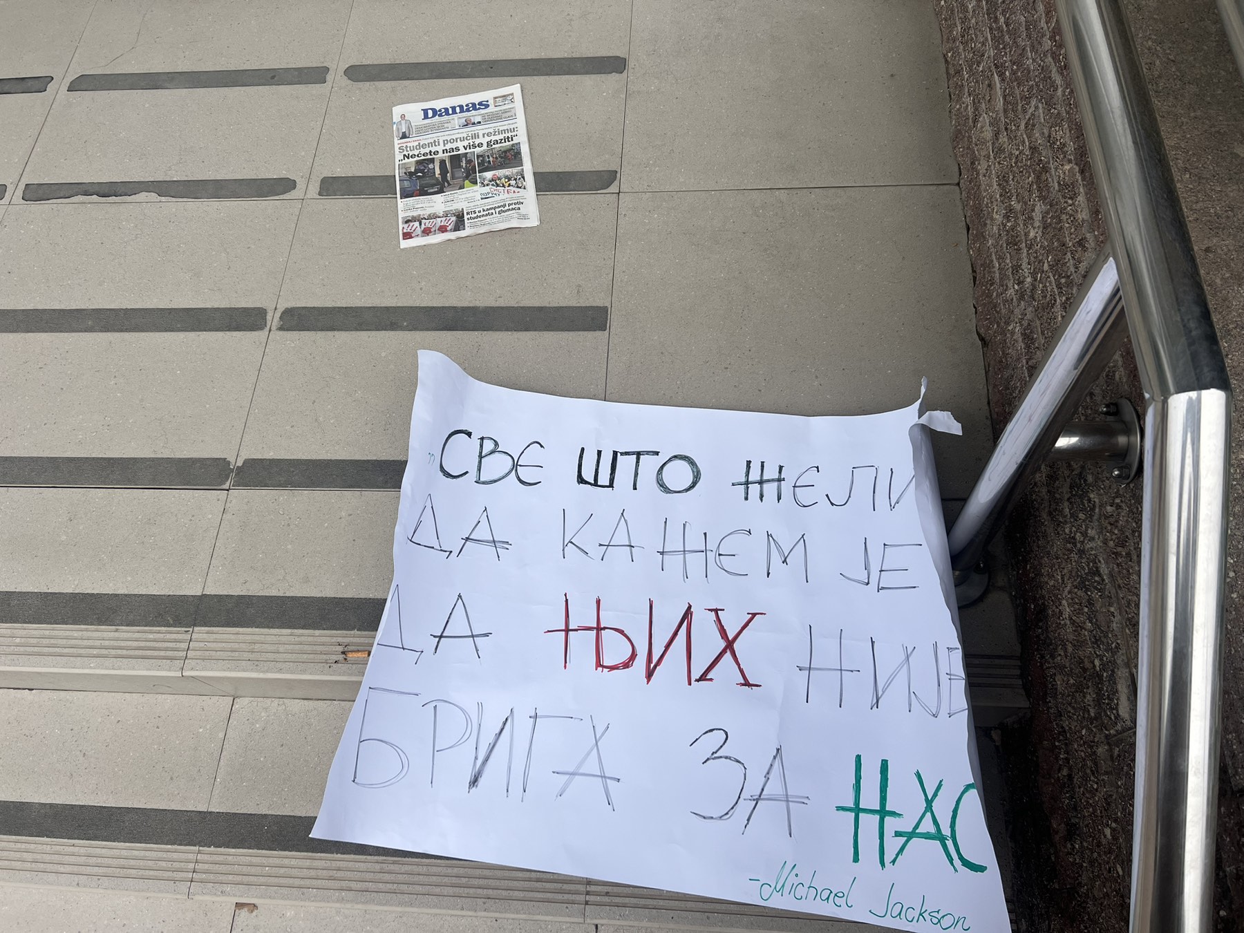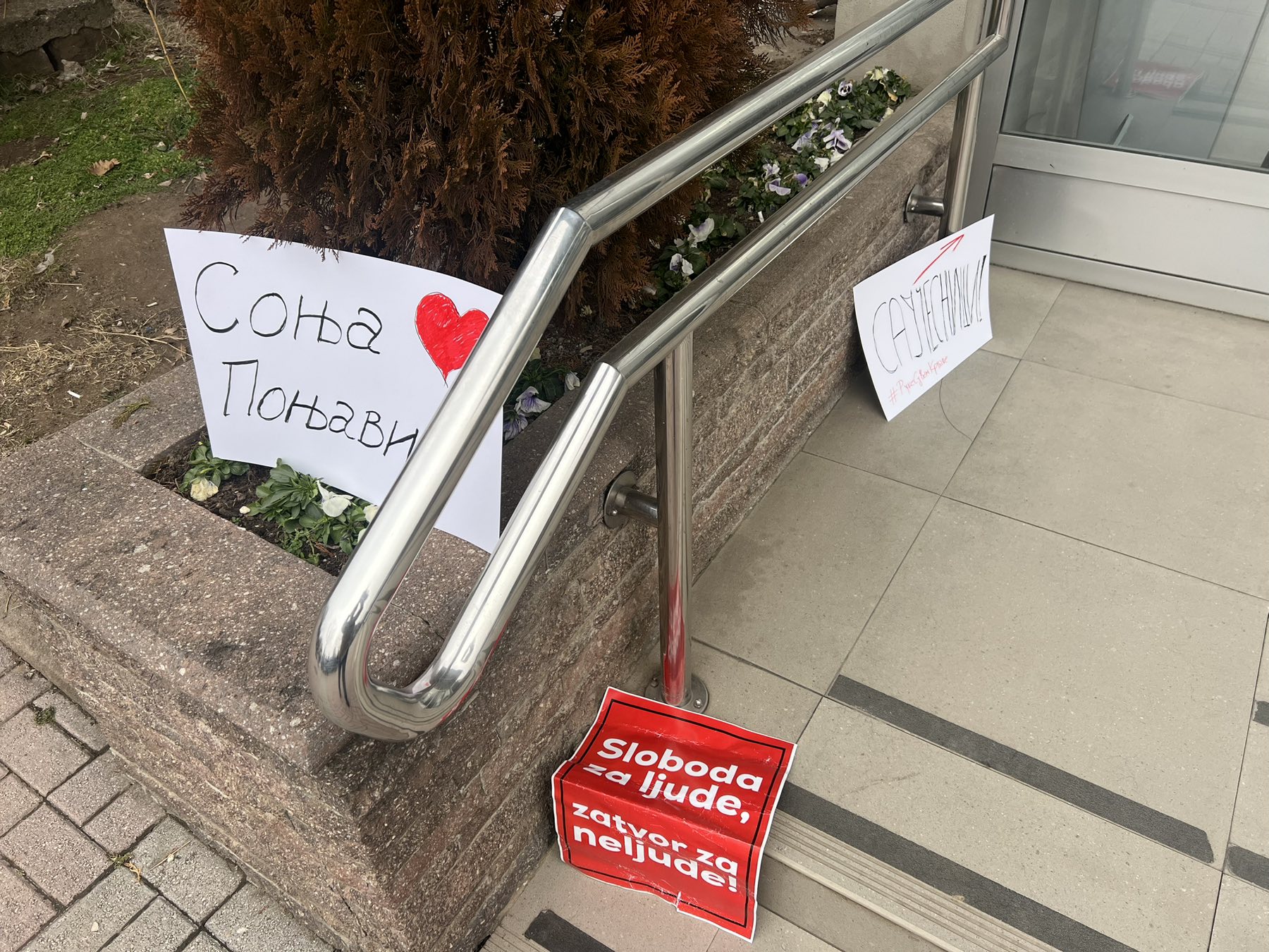 Na ulaznom stepeništu zgrade ostavili su transparente „Sloboda za ljude, zatvor za neljude“, „Njih nije briga za nas“, naslovnu stranu Danasa sa porukom studenata „Nećete nas više gaziti“ i ime „Sonja Ponjavić“ – studentkinje iz Kraljeva, koju je juče u Beogradu, automobilom preko trotoara, pokosio vozač Ford Fokusa, kasnije optužen zbog toga za pokušaj teškog ubistva.